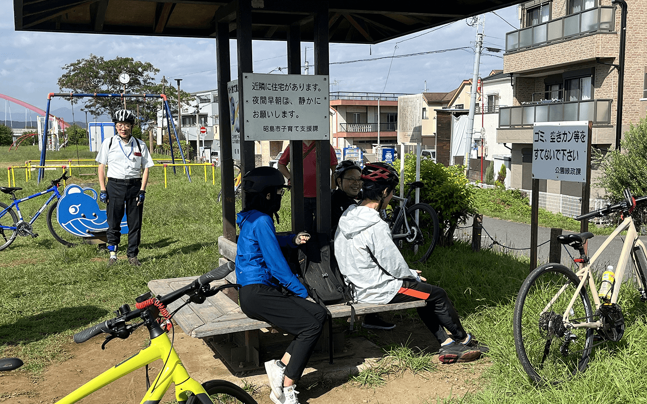 先に出発していた「クロスバイクグループ」は府中郷土の森公園を出発して約45分走ったところで、2回目の休憩スポットである福島第五児童遊園に到着しました。