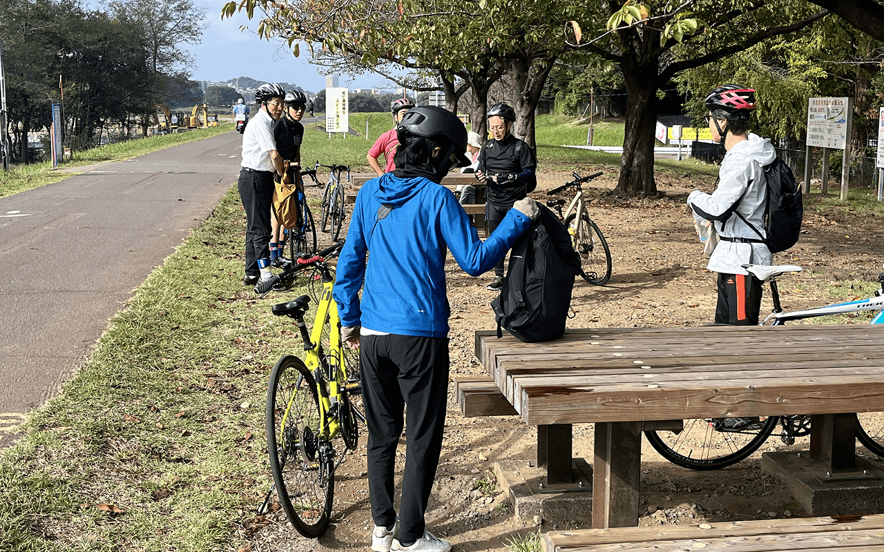 いつものツアーでは公園内のベンチで休憩していますが、今回のツアーは走行距離が長く時間短縮のためサイクリングロード沿いのベンチで休憩しました。