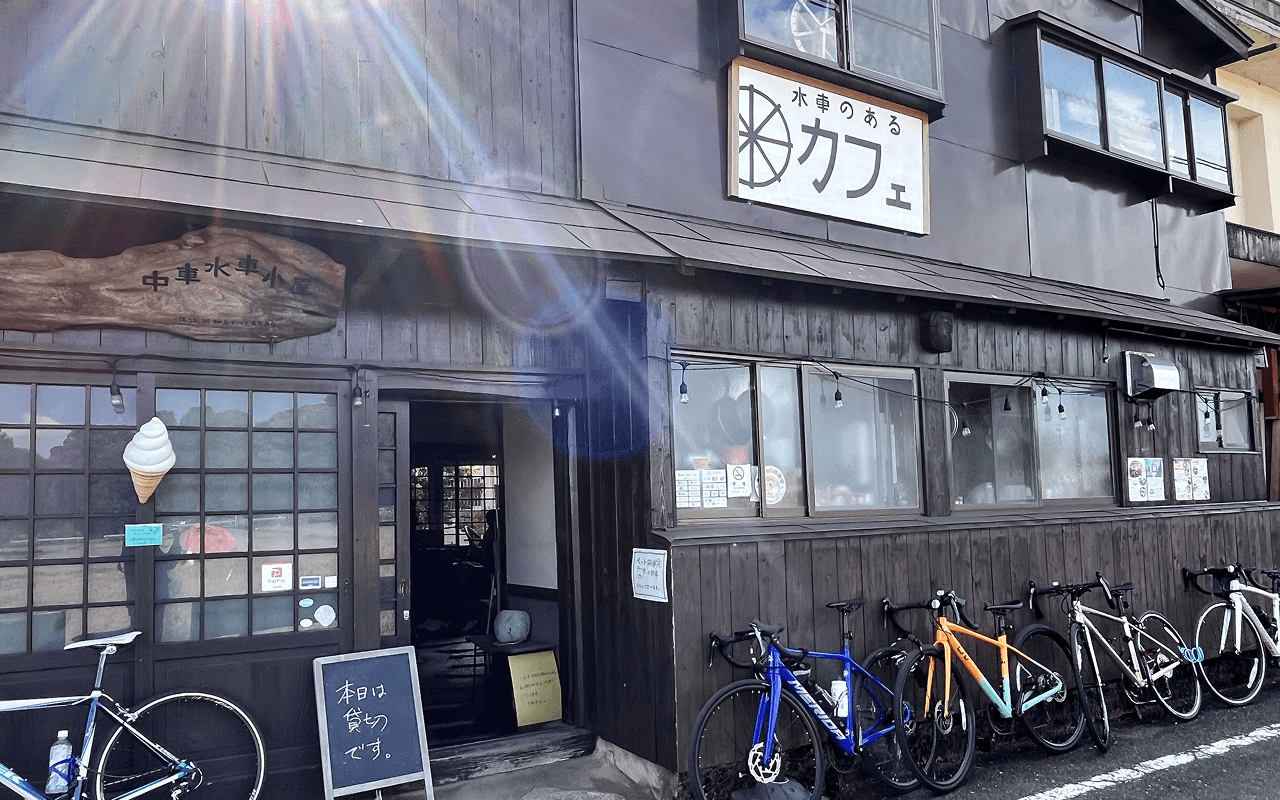 玉川兄弟の像からのんびりカフェ中車水車小屋は1kmとすぐに到着しました。お店の外と少し離れた駐車場に自転車を停めて店内に入ります。