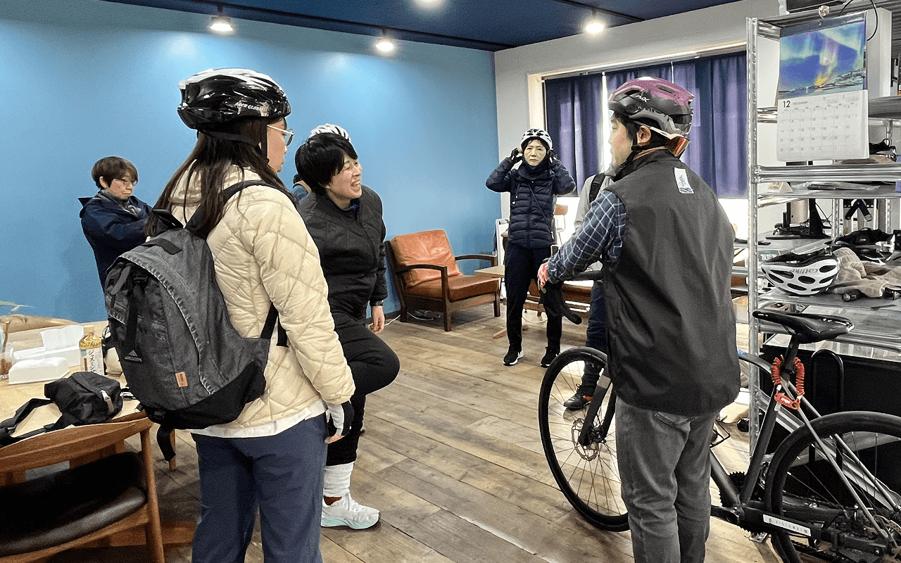今回のツアーでは3名の方が持ち込みで参加され、他9名の方はクロスバイクかロードバイクをレンタルして参加されました。いつも通りスタッフからツアーの行程を案内し、ハンドルの握り方やギアチェンジの仕方などをロードバイク、クロスバイクそれぞれについて説明しました。