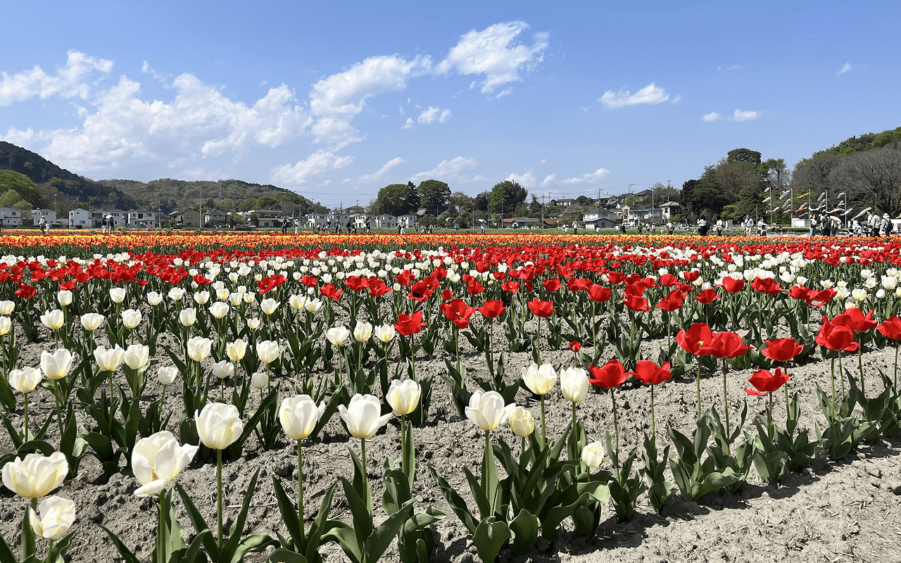 のんびりカフェ中車水車小屋の周りでは「はむら花と水のまつり」が開催されており、辺り一面に鮮やかなチューリップが植えられた畑を散策しました。
