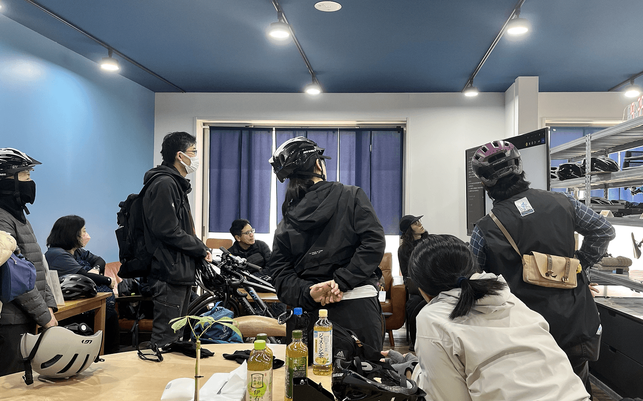 今回のツアーでは1名の方がロードバイクの持ち込みで、それ以外の11名のお客様がクロスバイクかロードバイクをレンタルして参加されました。毎回のツアー同様、クロスバイクとロードバイクのギアチェンジの仕方やハンドルの握り方などをスタッフが説明しました。さらに、今回のツアーでは一部車道を走行する箇所があったため、4月1日から始まる「自転車青切符導入制度」についても、見落としがちなポイントや正しいルールなどをお客様、スタッフ共に確認しました。