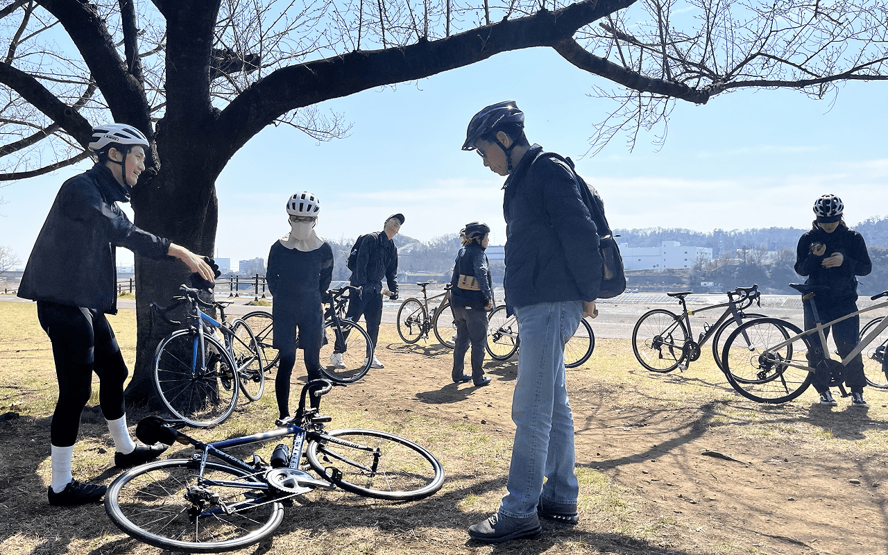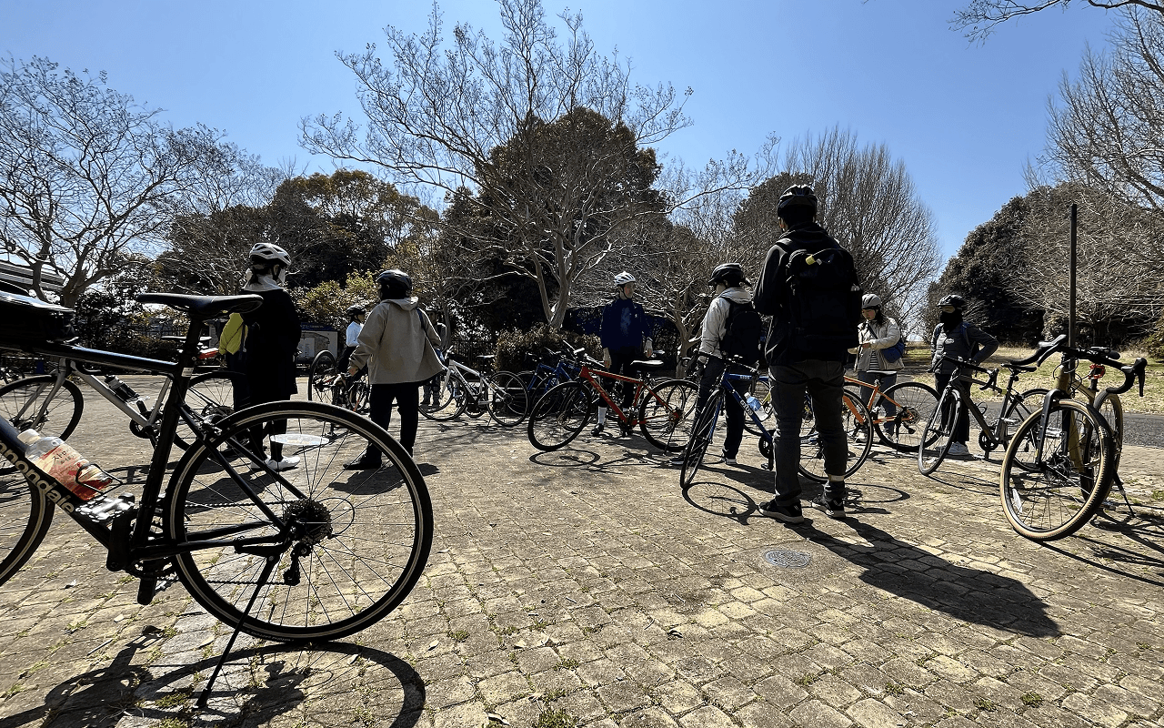 今回のツアーは、多摩川サイクリングロードの春の景色を楽しみながら、季節の花が咲く昭和記念公園を目指すツアーでした。2026年最初のサイクリングツアーということもありツアーに参加することを心待ちにしていた方も多く、予約枠もすべて埋まりスタッフ含め総勢17名でのサイクリングツアーとなりました。