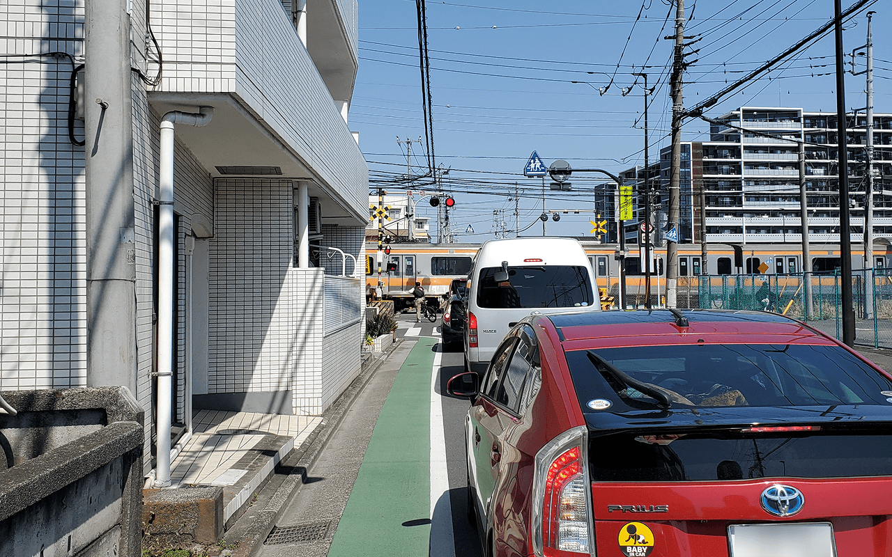 青切符の導入により踏切前での一時不停止(反則金6,000円)や、警報機が鳴り遮断機が下がっているのに線路内に立ち入る行為(反則金7,000円)なども青切符の対象となります。そのため、踏切前で必ず一時停止することをお客様にお伝えしました。交通量が多く踏切手前で車が渋滞していましたが、間を追い抜かすことなく安全に踏切を渡り切ることができました。