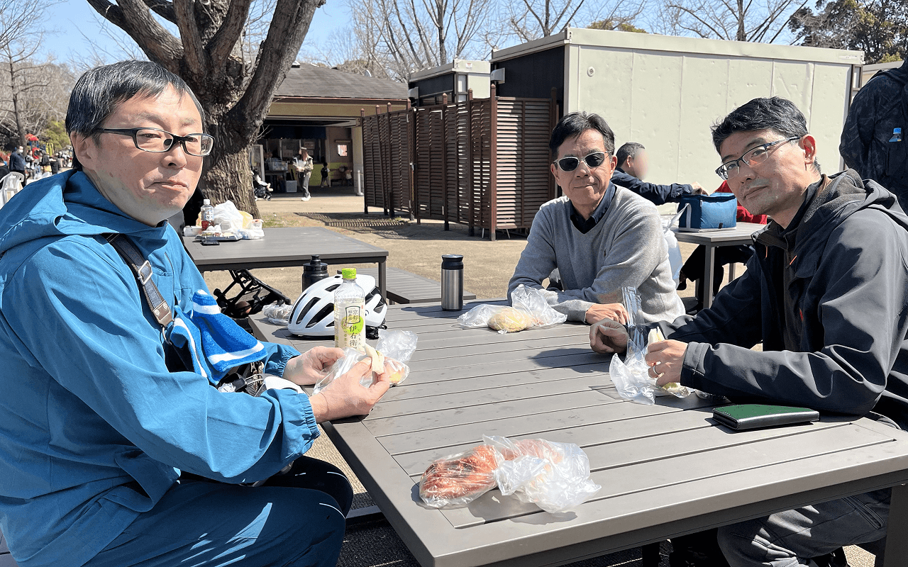 この日は暖かく外でご飯を食べていても気持ちが良かったです。私と一緒のテーブルに座ったIさん、Tさん、MさんはロードバイクのタイヤやTさんやMさんは自分の自転車を持っていたり昔乗っていたりしたこともあり、自転車の技術が進歩しているという話題で盛り上がりました。
