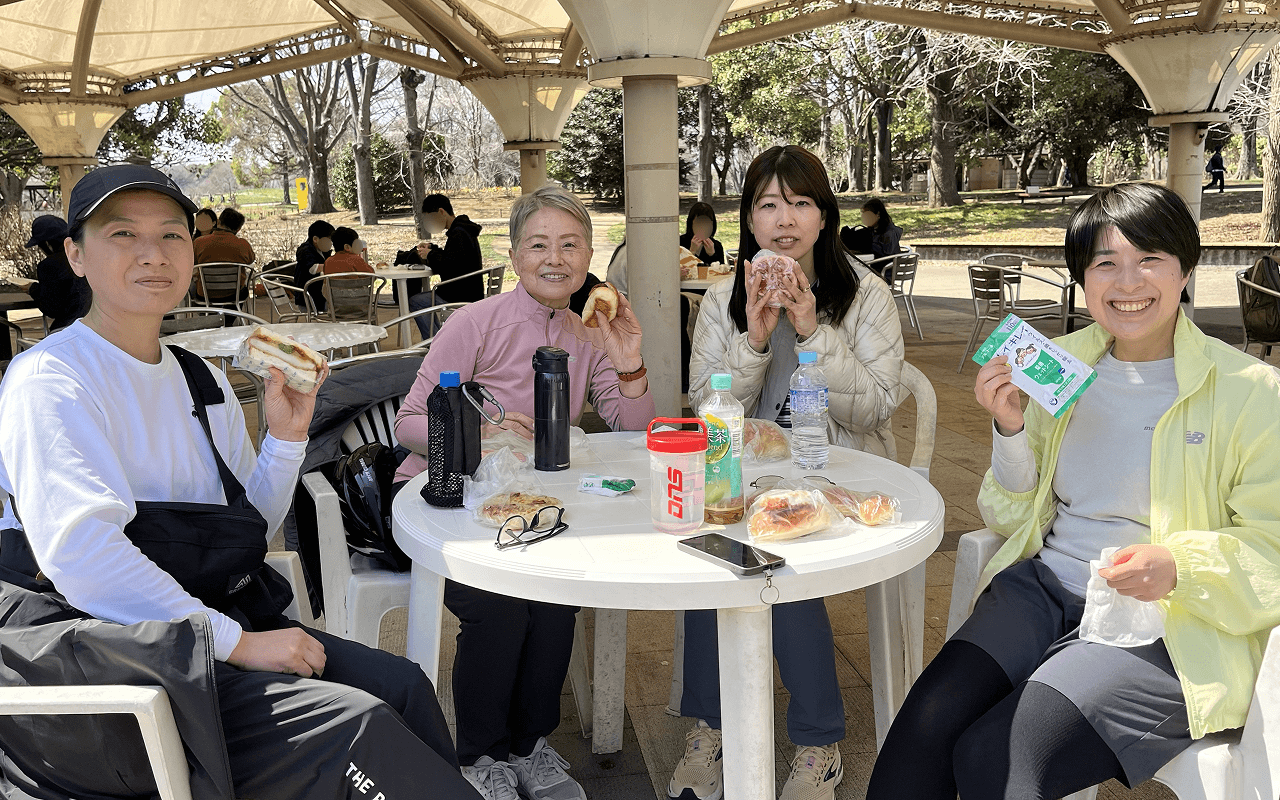 「原っぱ中央売店」近くの駐輪場に自転車を停めたらここからはランチタイムです。昭和記念公園内にはいくつか売店やレストランもありますが、今回のツアーでは途中でグループから離脱したスタッフが立川でパンを購入してくれたので、外の椅子に座ってピクニックをしました。好きなパンを2つずつ取り、売店でコーヒーも購入しました。